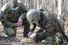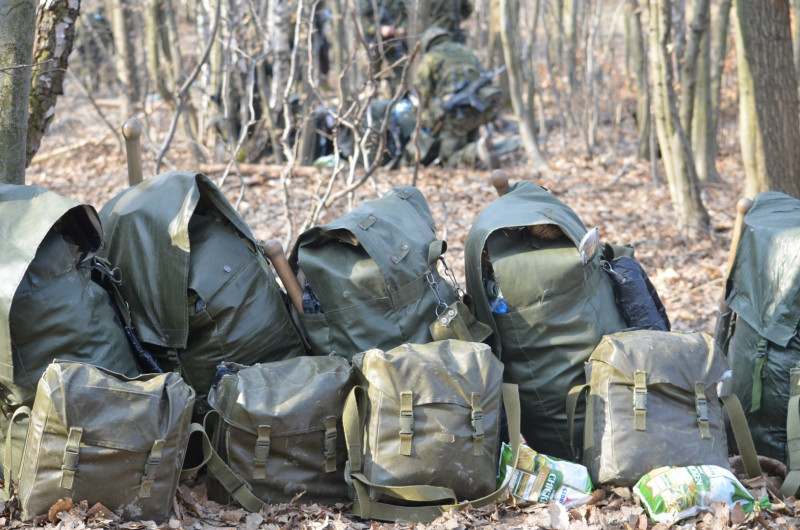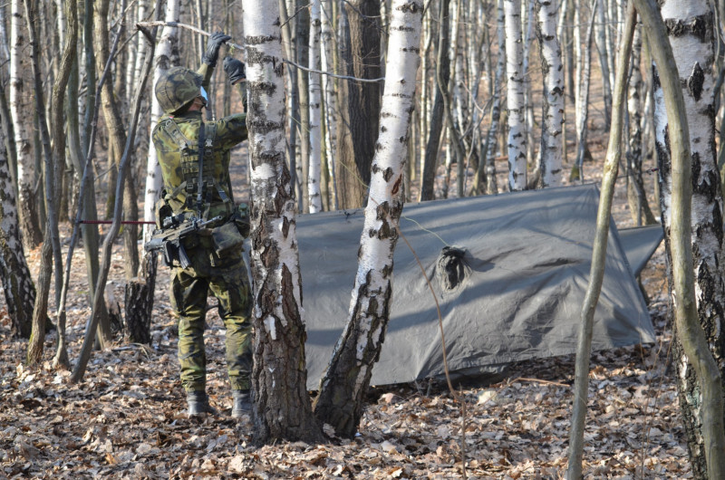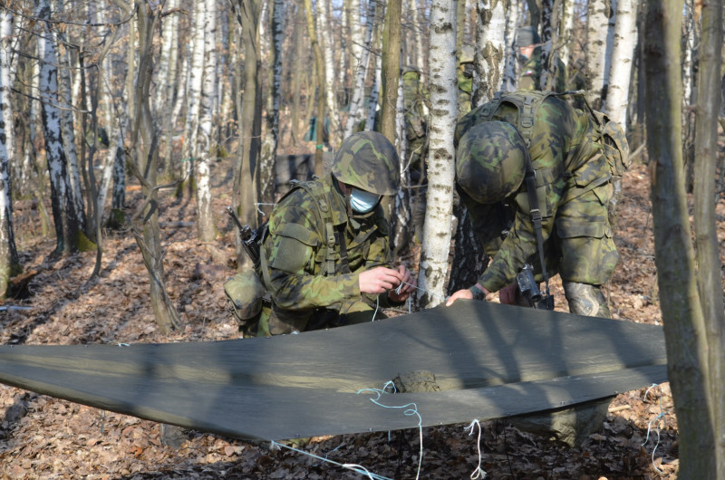Stejně jako před 14 dny záložníci a dobrovolníci, absolvovali i armádní nováčci v závěru kurzu komplexní polní výcvik. Do vojenského výcvikového prostoru se vydali pěším přesunem po brzkém ranním poplachu ve středu 10. března. V místech, kde trávili nejen den, ale i noc, si pod vedením instruktorů začali budovat nejprve okopy. V dopolední činnosti tak vládla polní lopatka. Kopat si okop pro ležícího střelce vleže v zmrzlé půdě a ještě s rouškou dá člověku opravdu zabrat. Není divu, že někteří nechtěli v dohledné době už lopatku ani vidět, ale to se jim bohužel nesplnilo. Použili ji totiž hned v odpoledních hodinách, mimo jiné k vybudování si přístřešků pro nocování. V rámci přežití v zimních podmínkách museli nováčci zvládnout také rozdělat oheň pomocí křesadla, či připravit stravu. Na cestu do výcvikového prostoru tak kromě dalšího neseného vybavení na dva dny přibyla i mrazená kuřata…
