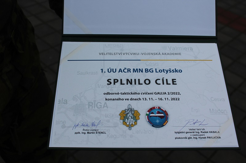 Certifikační cvičení 1. ÚU AČR MN BG Lotyšsko se odehrálo ve vojenském újezdu Březina. Podobně jako s pontonovou jednotkou se zaměřilo nejen na samotný bojový výcvik, ale i na situace pramenící ze života na základně. „Byly tam scénáře, které se opravdu můžou stát. Např. různé návštěvy politiků, vojenských představitelů nebo různé rozhovory pro média a sdělovací prostředky včetně televize,“ popsal jednu z mnoha nasimulovaných situací řídící odborného taktického cvičení podplukovník Martin Štencl. Kromě toho si vojáci vyzkoušeli reakci při závadě na vozidle nebo dopravní nehodě: „Tady jsme využili i příslušníky vojenské policie, kteří jsou také v sestavě anebo zdravotní zabezpečení,“ dodal podplukovník Štencl.